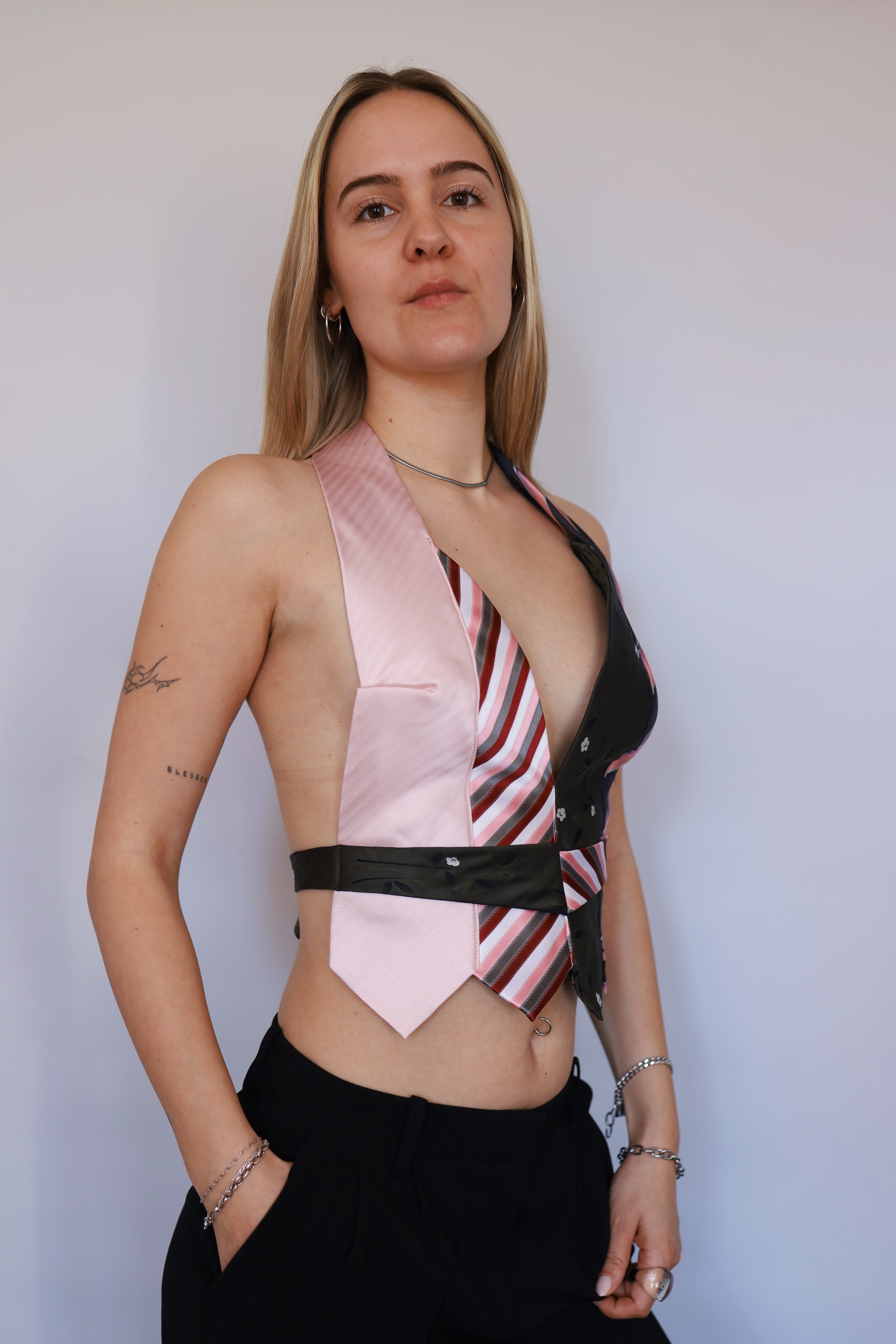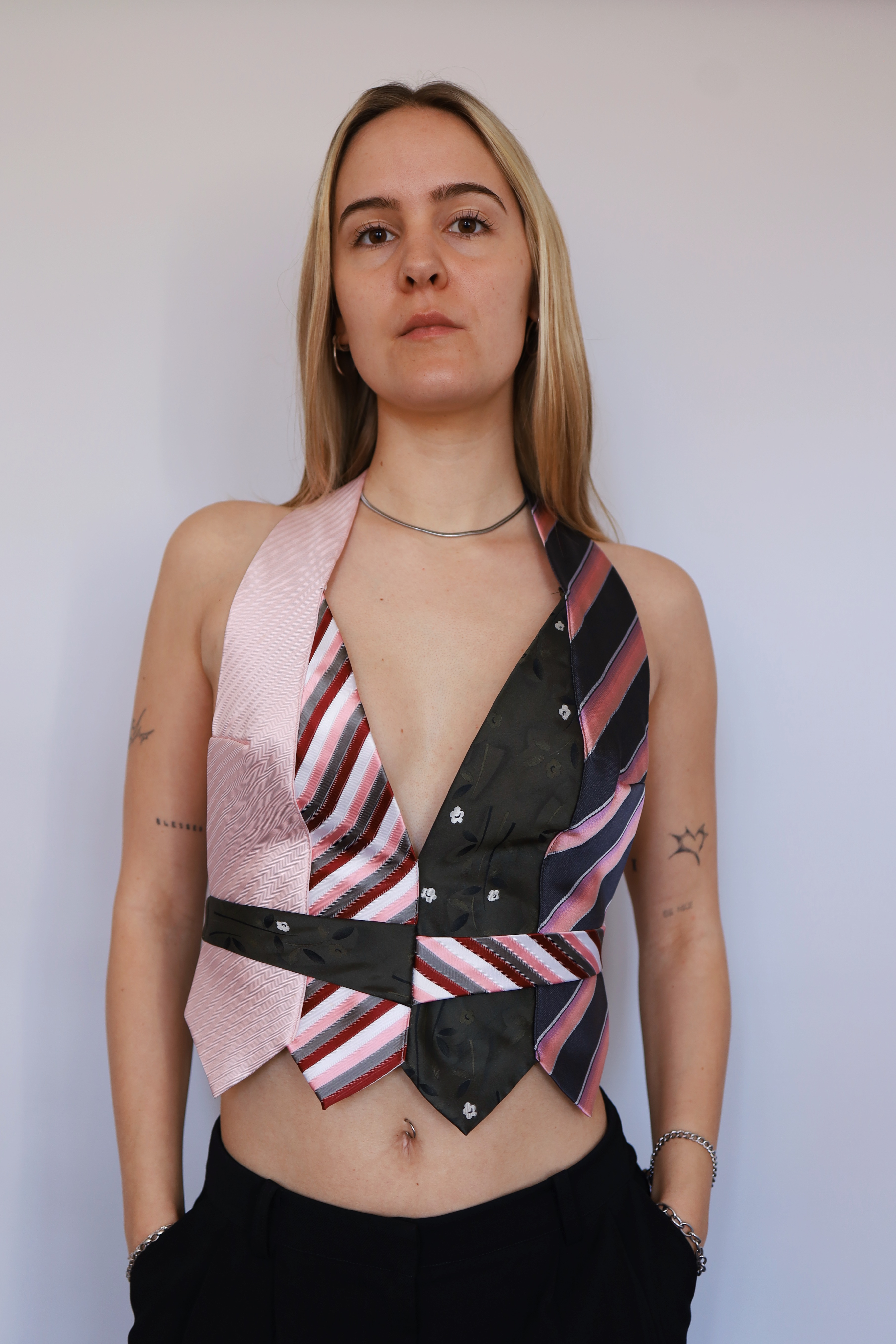 Dieses Top wird aus Vintage-Krawatten gefertigt und neu zu einer körpernahen Silhouette zusammengesetzt.