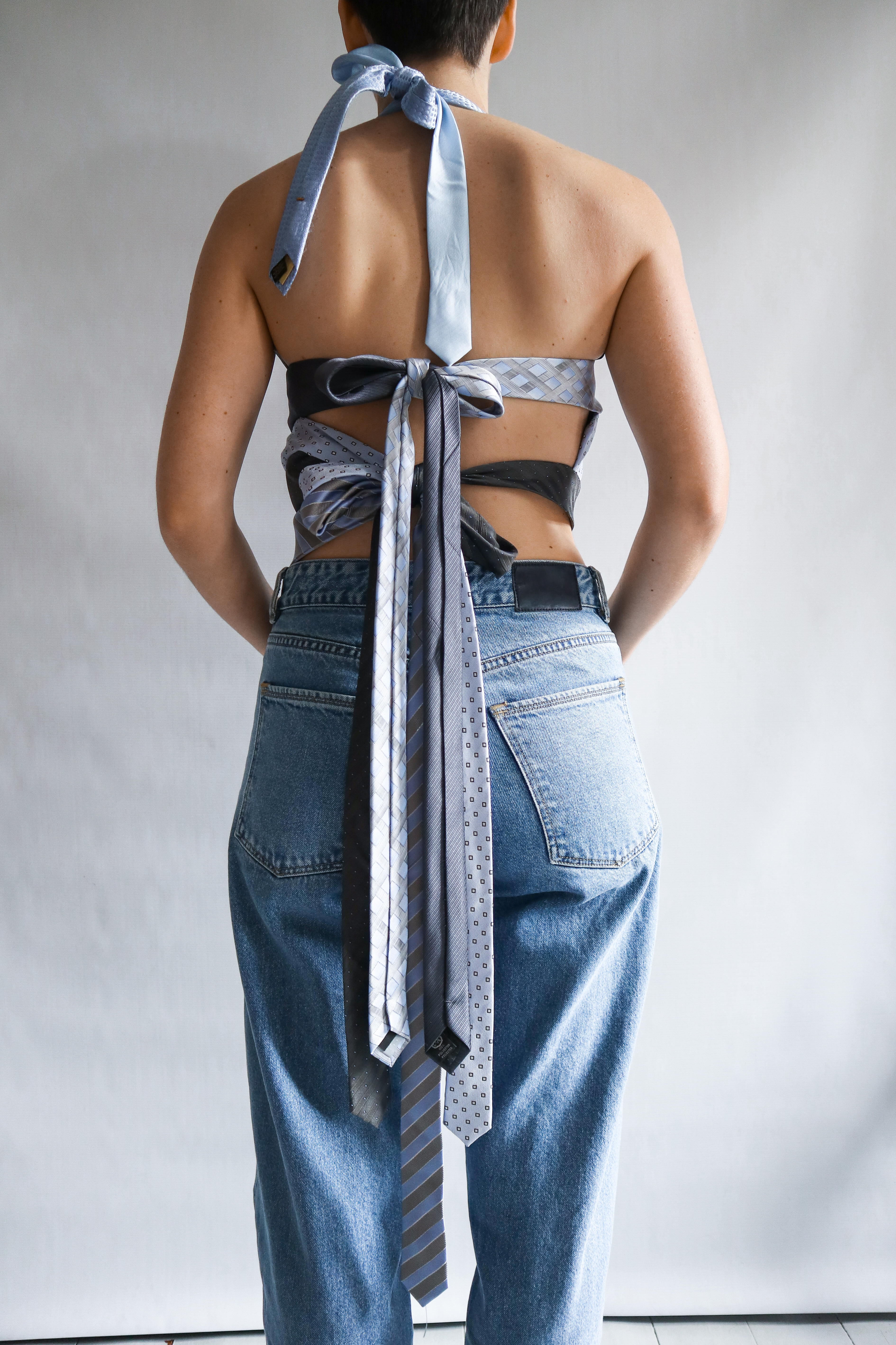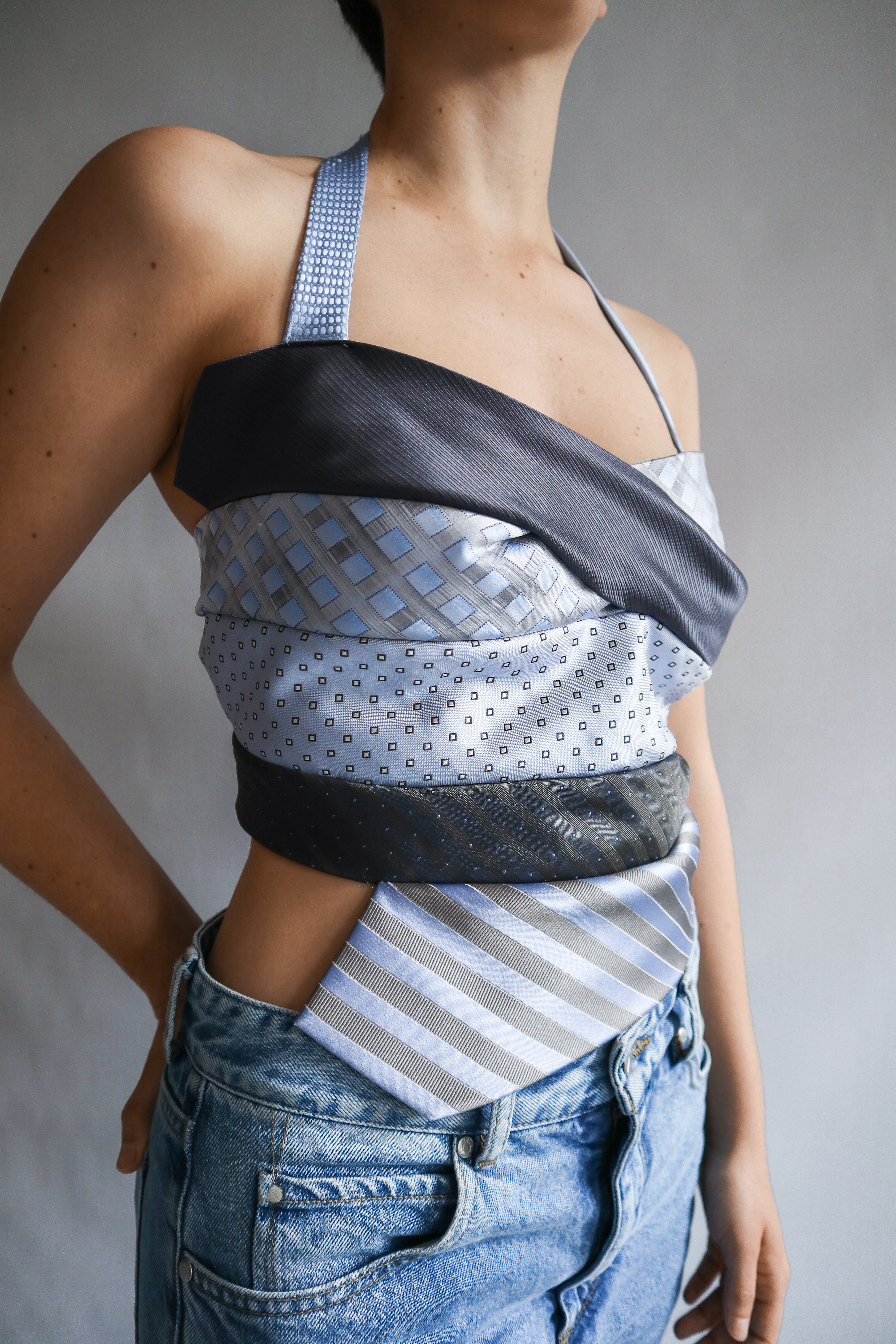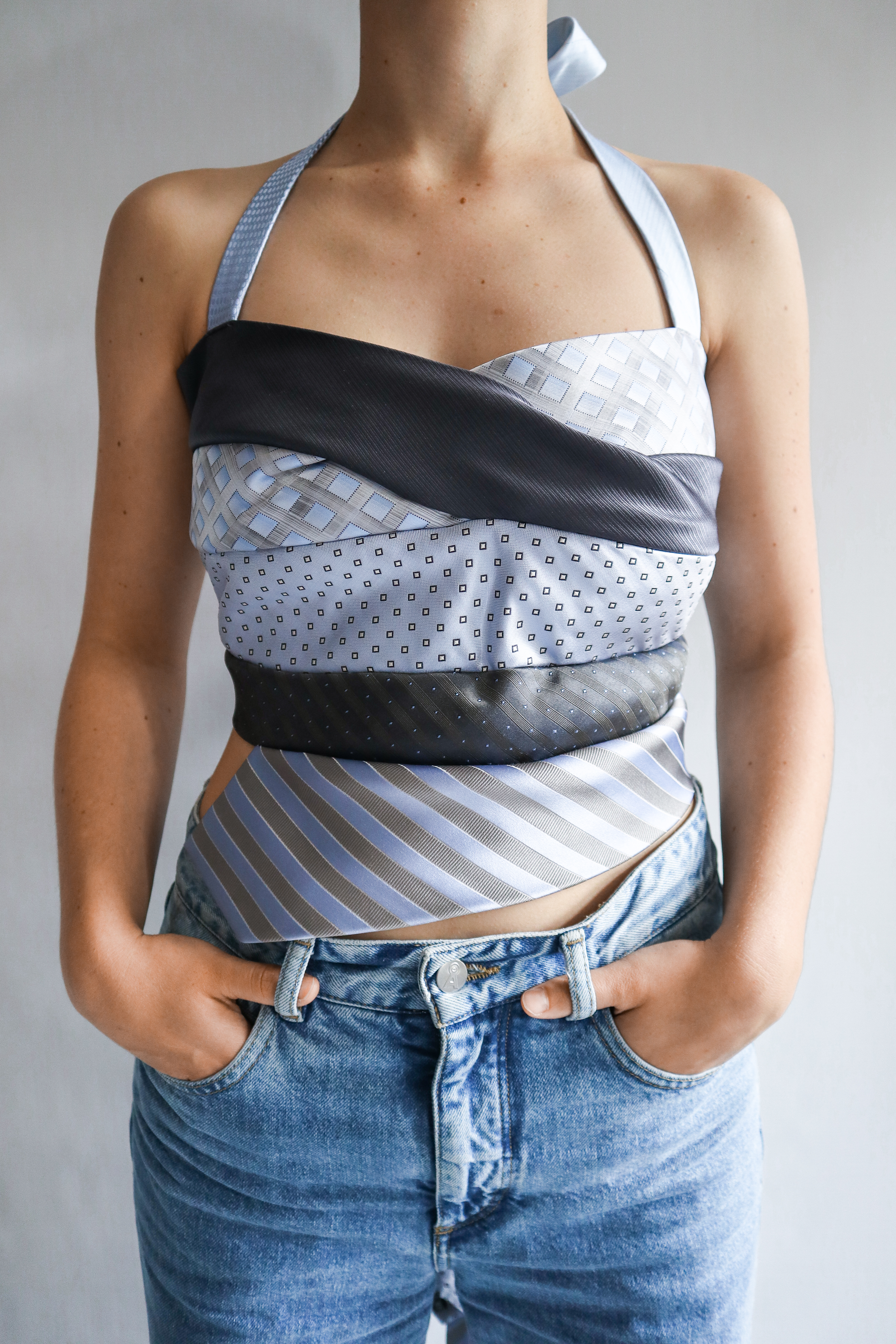 Dieses Top wird aus Vintage-Krawatten gefertigt und neu zu einer körpernahen Silhouette zusammengesetzt.