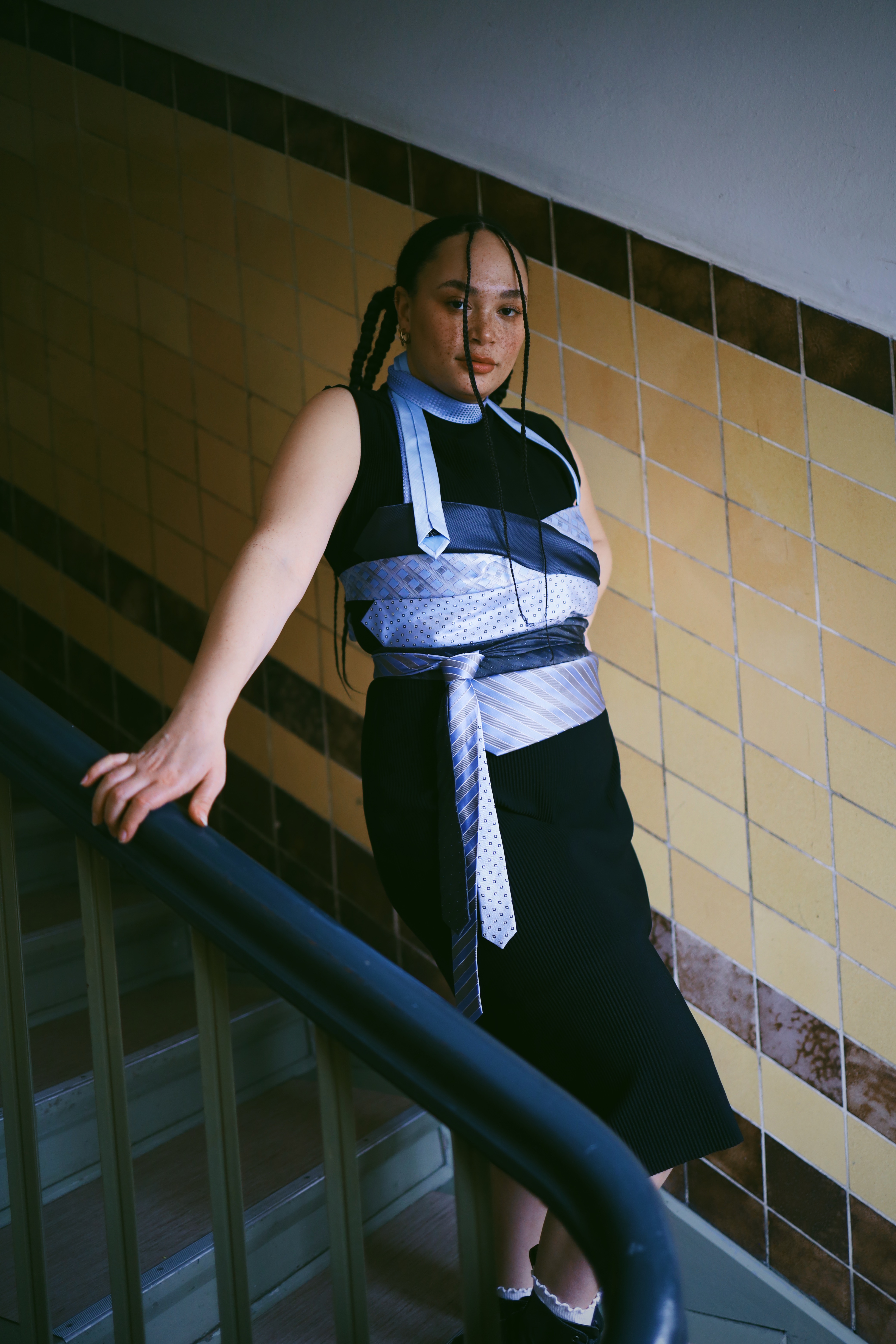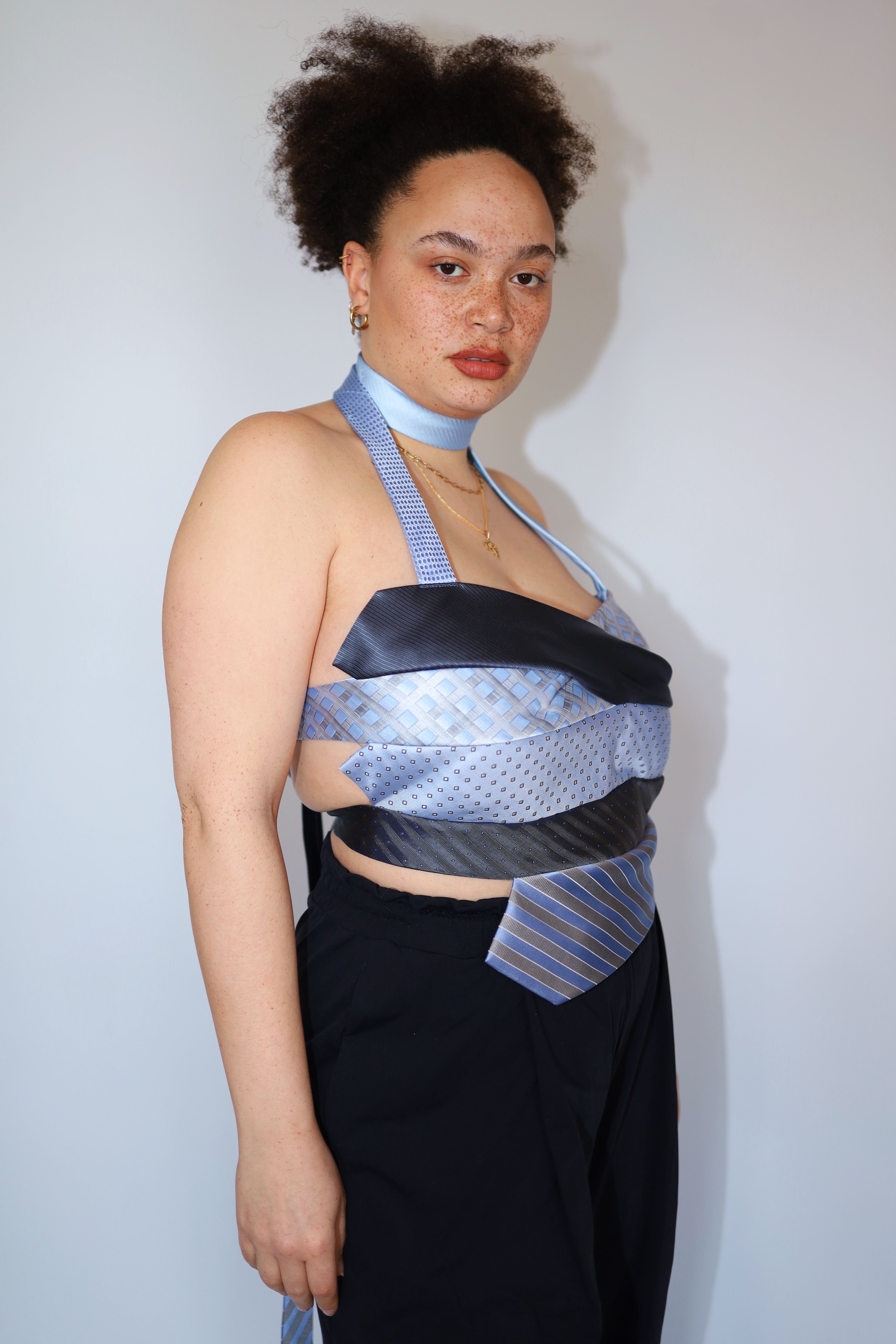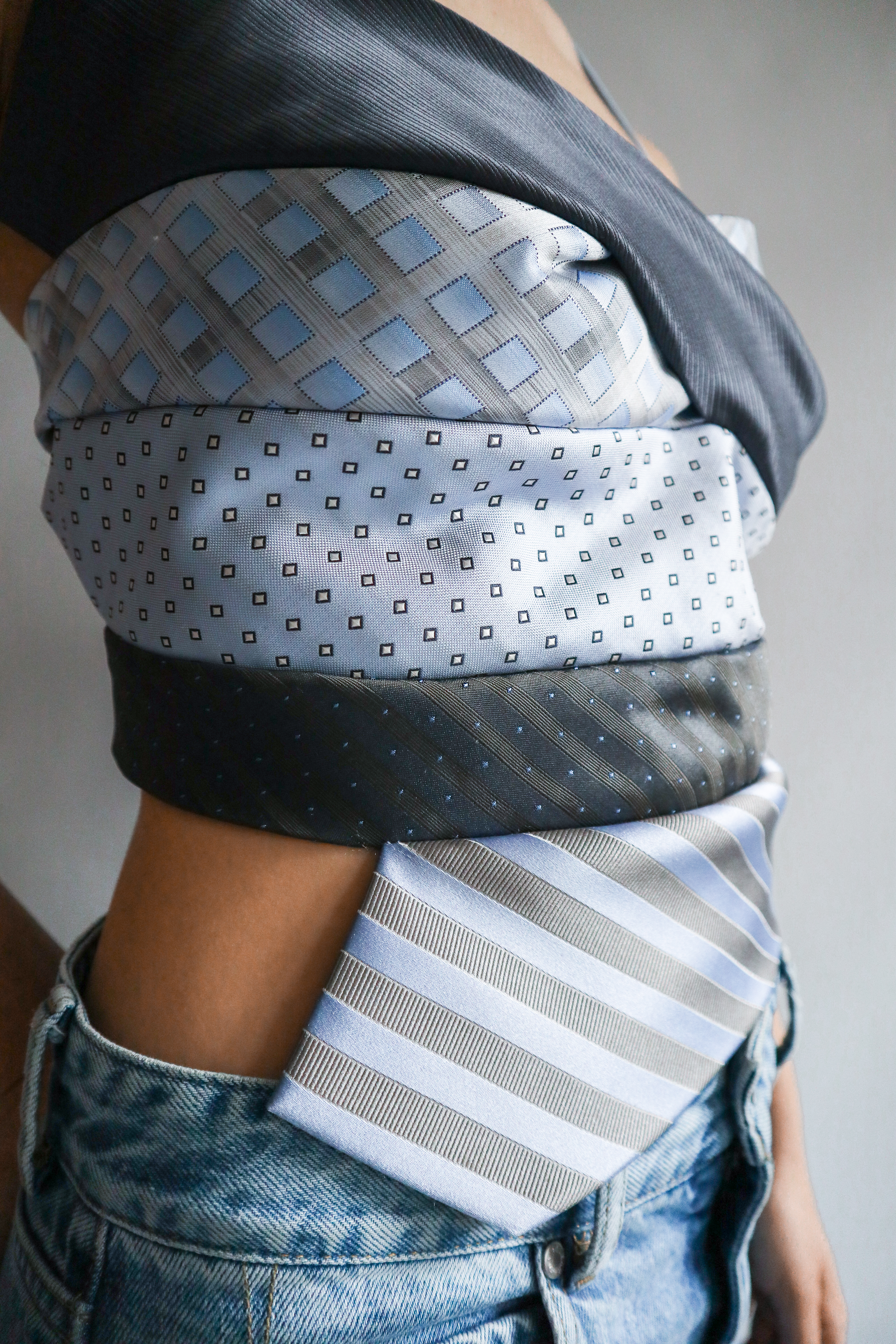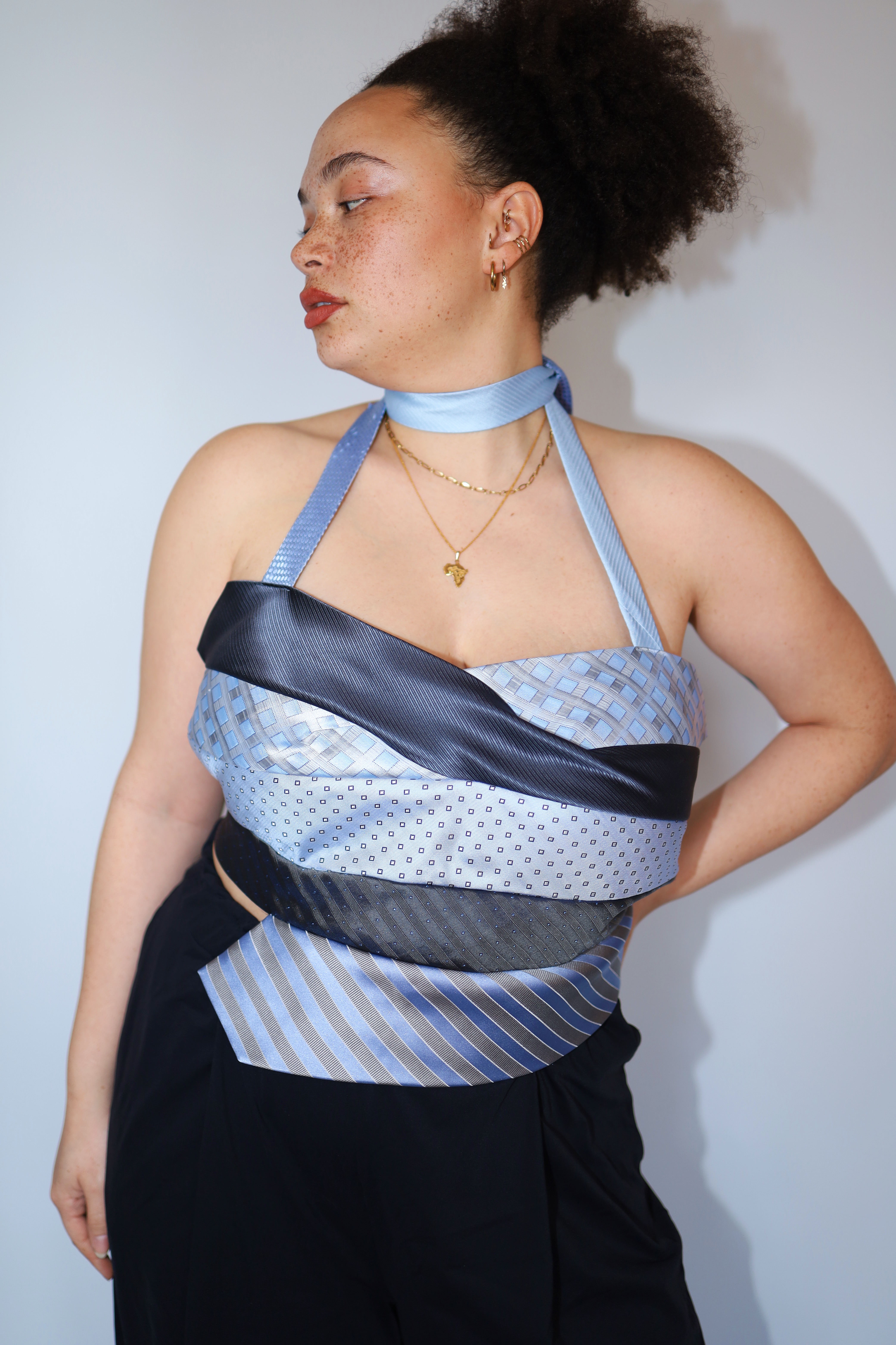 Dieses Top wird aus Vintage-Krawatten gefertigt und neu zu einer körpernahen Silhouette zusammengesetzt.
